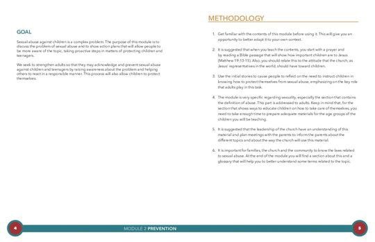 The purpose of this resource is to raise awareness about the problem of sexual abuse and to provide practical steps that encourage greater participation in the protection of children and adolescents. It is not intended to address the issue in depth, rather to provide practical action to help protect children and adolescents. This resource is part of the "Resource Kit to Reduce Child Sexual Violence," which is designed for adults in the context of the church who are interested in helping children and specifically, protecting them from sexual violence.