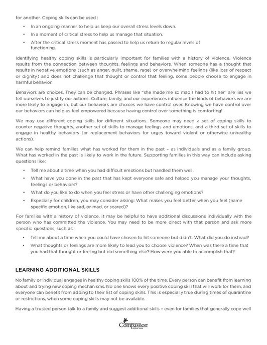 This document serves as a guide for working with and supporting families who have a history of violence. It includes ways a church worker can help families reduce stress, build on strengths and learn coping skills to increase safety in the home. It also discusses how to develop a safety plan with victims of violence in case of a crisis.