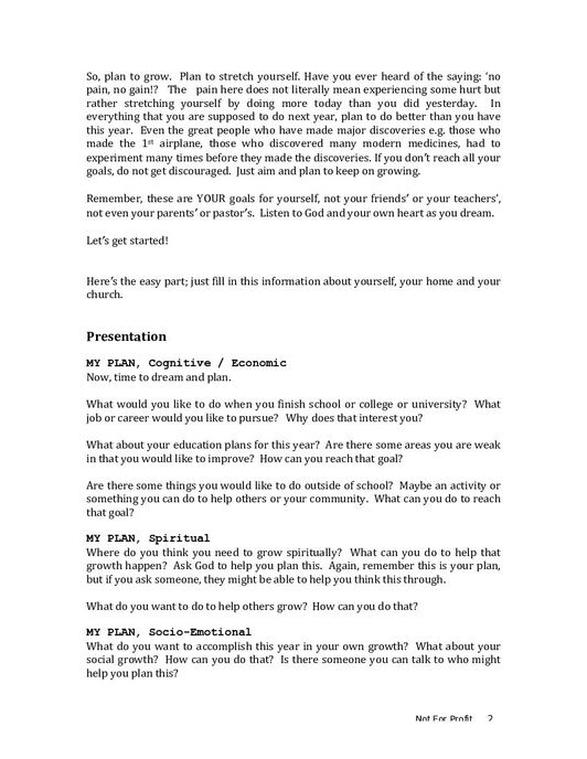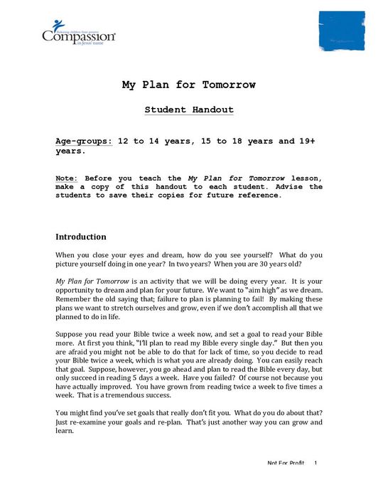 The document, “My Plan for Tomorrow- Student Handout” is designed to guide youth through goal setting and future planning. This version of My Plan for Tomorrow is contextualized for English-speaking African students. It is used as an accompaniment to the My Plan for Tomorrow workbook. This is a yearly activity for youth age 12 and above that encourages them to dream and plan the cognitive, spiritual, socio-emotional, and physical areas of their lives. This handout guides youth through a series of questions to help them develop goals and also includes a self-evaluation to measure growth at the end of the year.