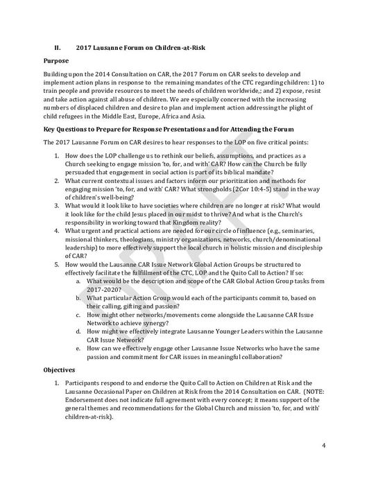 The Lausanne Movement connects influencers and ideas for global mission, with a vision of the gospel for every person, an evangelical church for every people, Christ-like leaders for every church, and kingdom impact in every sphere of society. May 14-17, 2017, leaders of seminaries, churches, and ministry organizations will gather at the Lausanne Forum on Children-at-Risk to form collaborative plans for the global Church to prioritize and act on mission to, for, and particularly, with Children-at-Risk (CAR). Attendees can find the prospectus for the forum on this page.