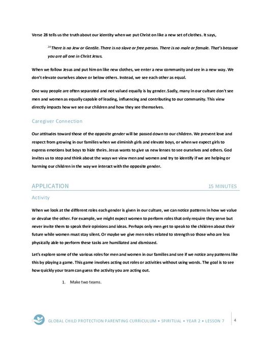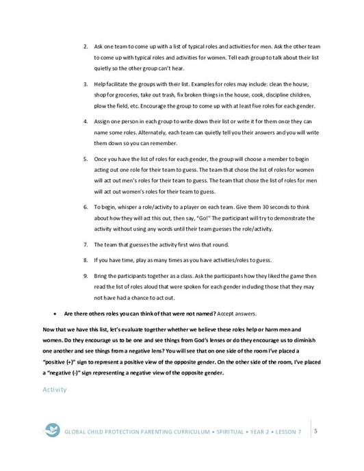 Parents and caregivers discuss common gender roles practiced within families in their community. They explore how these gender roles can affect children's views of themselves and the opposite gender. Caregivers consider positive attitudes and practices that value both genders equally and examine negative heart attitudes that affect how they view the opposite gender, recognizing that their attitudes are likely to influence their children.